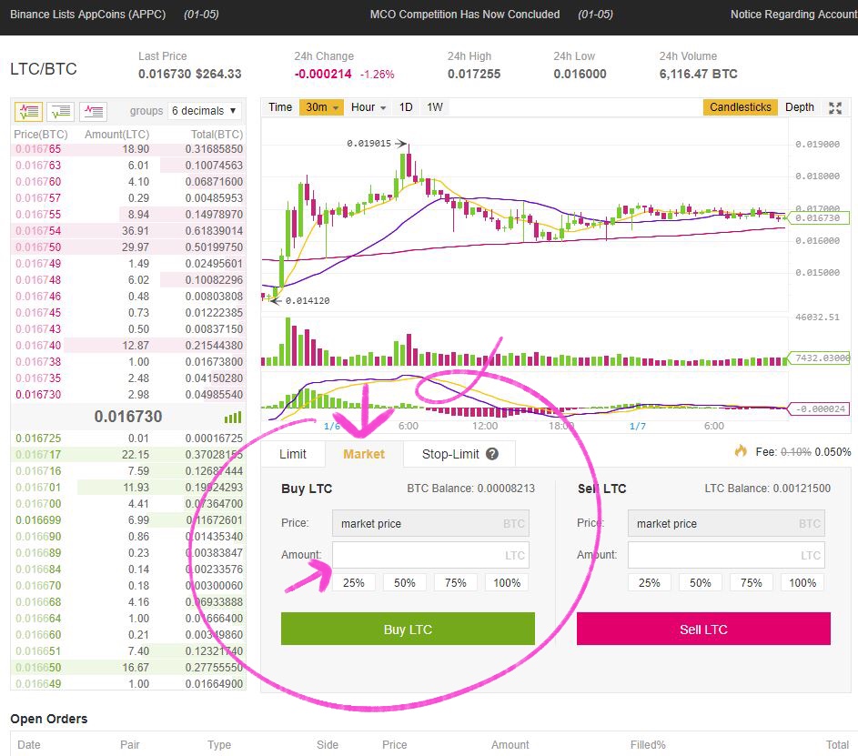 The first coin you want to buy using this method is the Binance BNB coin. Be sure that you’ve opted to use BNB to pay your fees. Otherwise, after the fees you will be left with a partial coin each time you trade and you won’t be able to sell it.